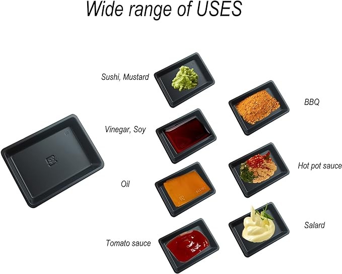 • Multifunction application - prefect for Sushi, mustard, vinegar, soy, oil, BBQ, salard, tomato sauce; good for serving sample dessert appetizer