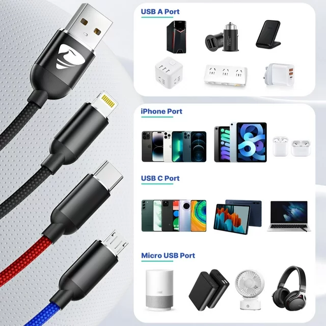 This multi charging cable with 3 different USB ports, including Micro USB, USB-C, and iP connectors. Support to charger most of the mobile phones available on market. 4 ft is the perfect length for a charging cable for various applications, 3-in-1 design, support 5 Vlots 3 A fast charging, makes the cord portable and only need one cable when you are on a business trip or traveling.
