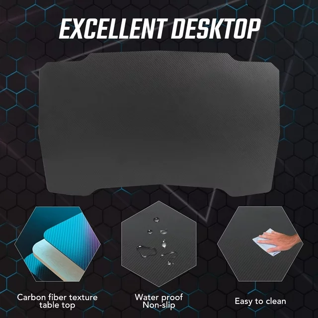 • Large Surface:This gaming desk workstation provides massive space for PC, gaming keyboards, gaming monitors and other gaming gear. Smooth carbon fiber texture surface for a comfortable gaming experience.