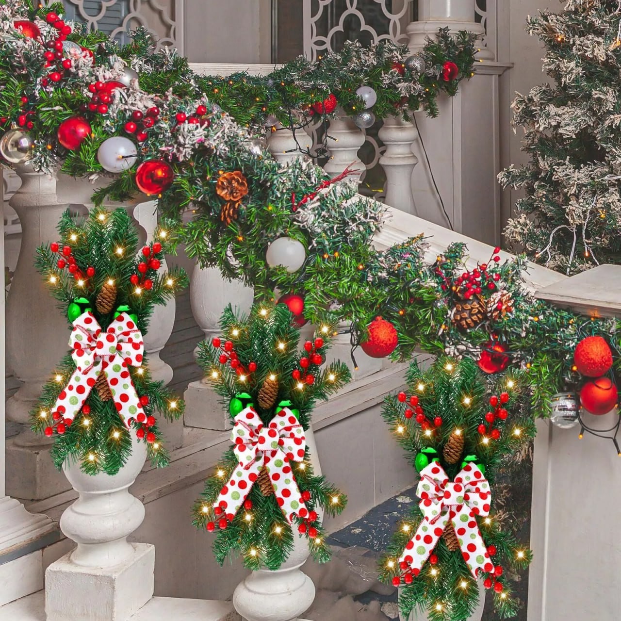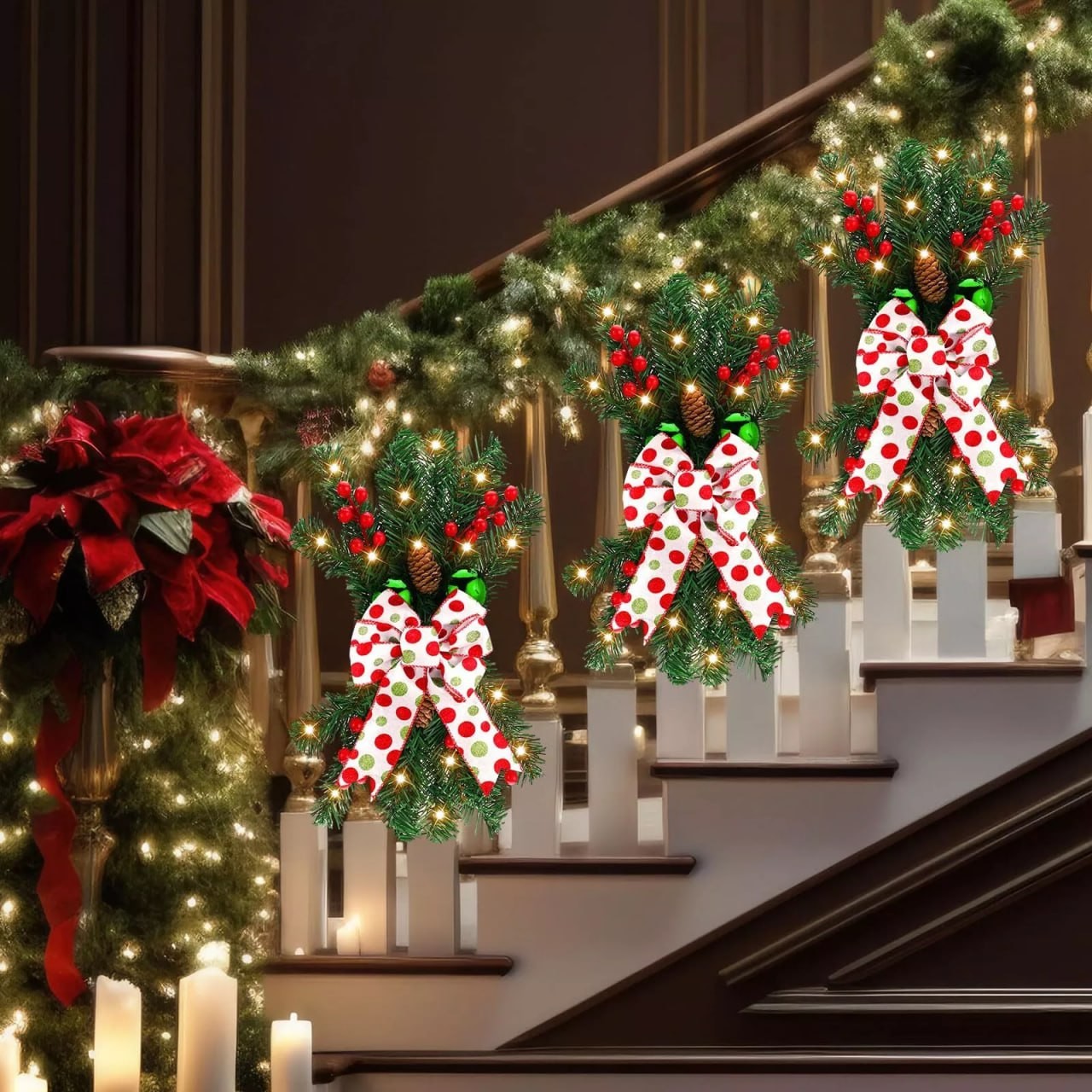 Nothing says Christmas like beautifully designed Christmas swags for staircase. The big bow on each swag further enhances the jubilant atmosphere, making your house or shop become a beacon of holiday spirit.