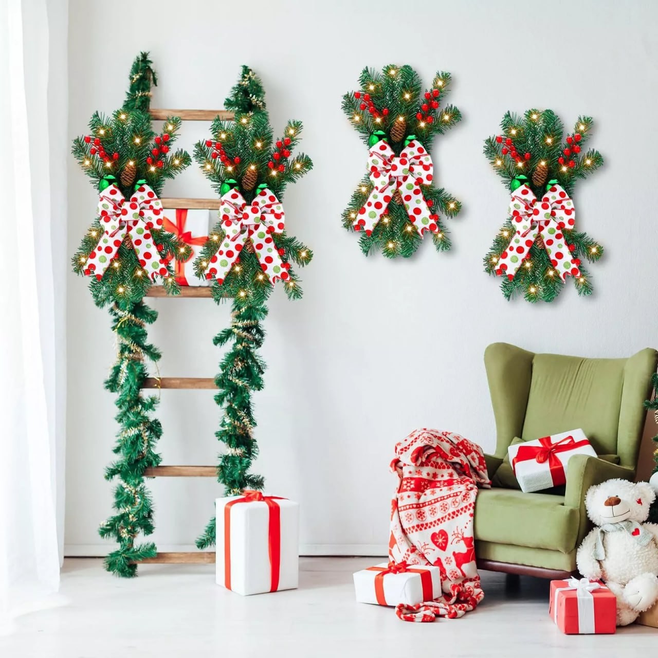 4 Pc Christmas Wreath LightUp Staircase Prelit Stairway Garland Door Wall Window