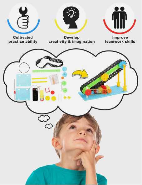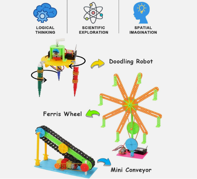 This 5 set stem kit can be build Mini Tank, Doodling Robot, Aircraft Car ,Mini Conveyor, Ferris Wheel,during build these kit can develop children's practical ability of using hands and brain. |