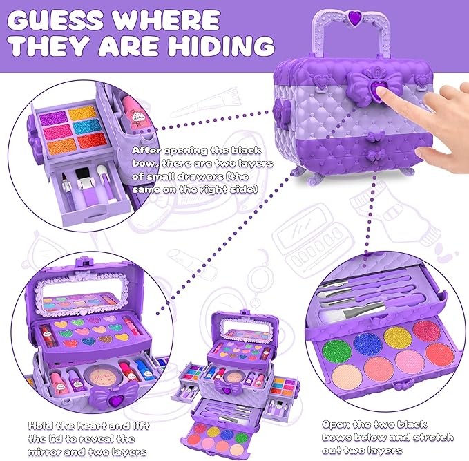 Purple Theme Beauty Set:The special Purple makeup set is designed for your little princess. Children always dream of fairy tales, and we should protect the child's innocence and princess's dream. Beginners can easily dress up with the little girls makeup kit.