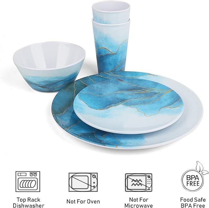 • Food Safe Melamine - The Melamine Dinnerware Set is made of 100% premium melamine,a hard plastic like ceramic but lighter and more durable, not easy to break, the material is BPA Free, odorless and food-safe
