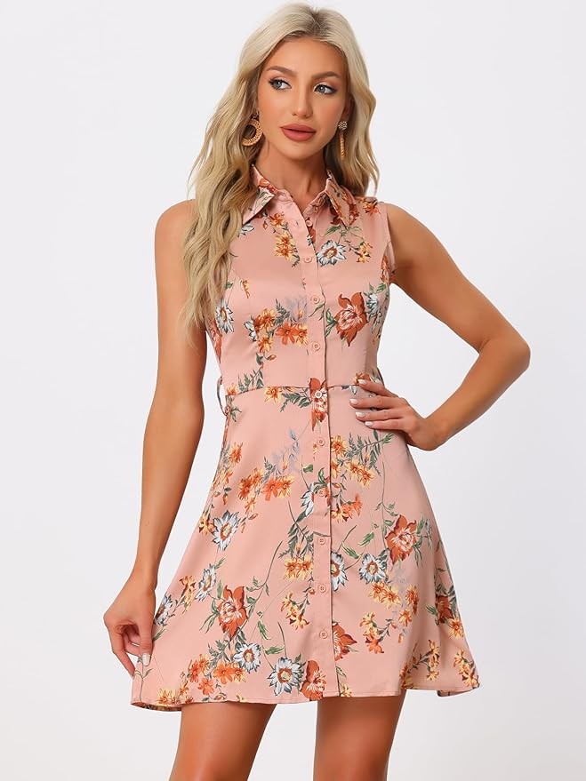 Allegra K Women's Sleeveless Turndown Collar Above Knee Button Down Floral Print Dress