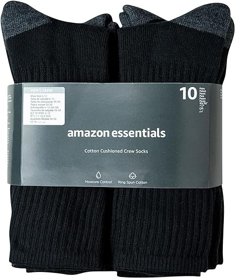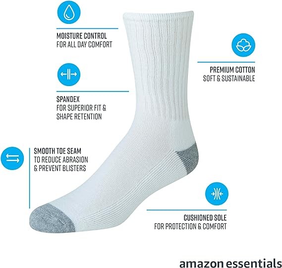 MATERIAL: Amazon Essentials socks are made from high-quality and durable materials. These socks are a cotton-poly blend with elastane for superior fit and shape retention.