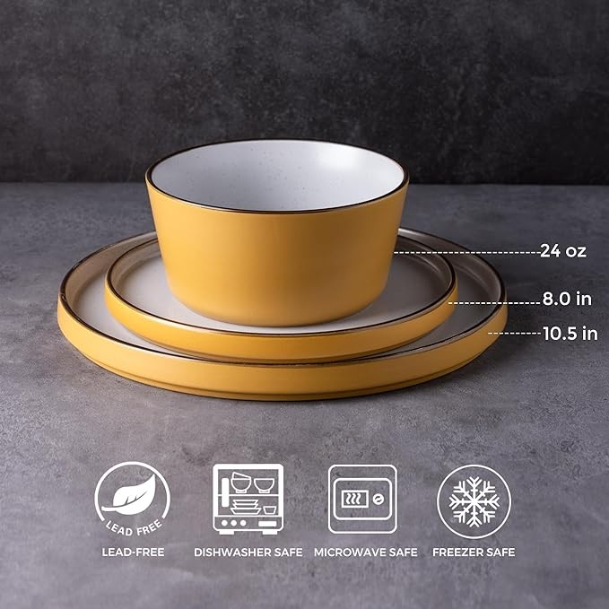 ELEGANT AND MODERN:Our dinnerware set are designed with two different glazes,the surface develops a white-grey color withe Speckled,and the egde and button cover with another beautifull color. This plates and bowls sets will make your table look more elegant and modern,making your food look even more delicious and happy every day for you,Perfect for housewarming, Thanksgiving, Christmas, and other fun celebrations.We are sure the items will Impress your guests by its unique and charming relief design.