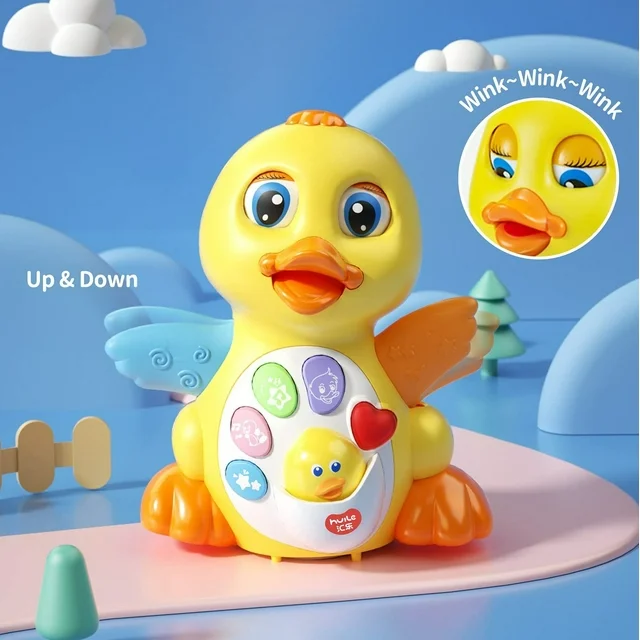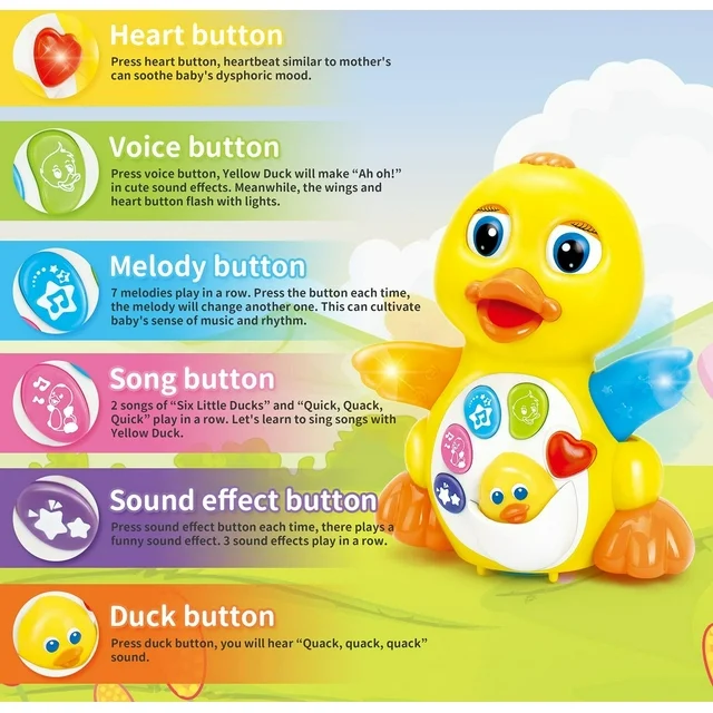 This dancing duck includes a head start button, sound effect button, voice button, red heart button, volume control, melody button and song button. The design was so cute that inclued the blinking eyes and flapping wings with flashing lights.