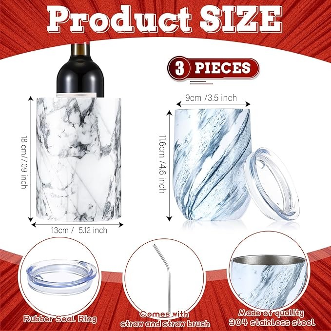 Portable to Carry: measuring approximately 7.09 x 5.12 inches/ 18 x 13 cm, the marble wine cooler is properly sized for easy handling, accompany it with 2 stainless steel wine cups that come in the package, each with a capacity of around 12 ounces, these portable sizes are practical adds to your picnic or other outdoor parties