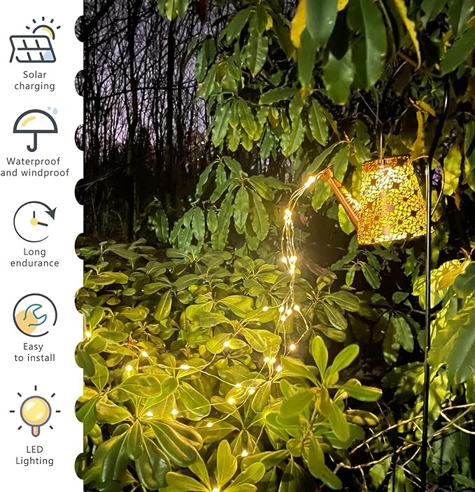 【OUTDOOR GARDEN LIGHTS】Our solar watering can light decor light collects sunlight during the day and lights itself up at night. It's like having a floating "kettle" in your garden at night that waters your flowers by itself.