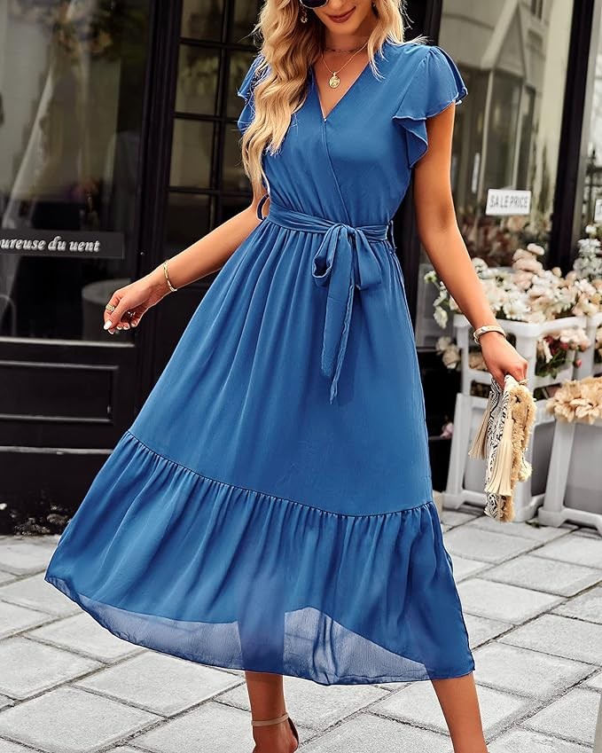 【Unique Feature】Ruffle Cap Sleeves, Short Sleeve, Cross V-Neck, High Waist, Allover Floral / Polk Dot Print, Elastic Waistband with Removable Belt, High Split, Above the Ankle Length, Fit And Flare Dress, Tiered Flowy Swing Dress, Wrap Dress, Ruffled Hem A-Line Dress, Midi Long Dresses, Beach Maxi Dresses that Hide Belly Fat.