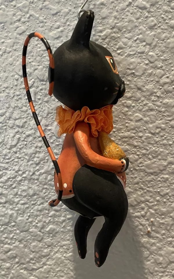 This discontinued Leeann Kress for Bethany Lowe Halloween Moon & Stars Cat ornament is brand new. It has never been used or displayed and was unwrapped for these photos only. It has its original tag.