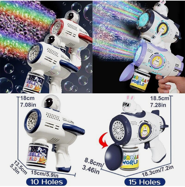 Unique Astronaut Theme Design - The appearance of the bubble machine is designed with a unique astronaut theme, which is loved by kids. The bubble gun ergonomic handle is comfortable to hold and won't slip off easily. The bubble machine comes with 80ml of bubble liquid and can support about 1h of uninterrupted play. On first use, bubbles will appear after 8 seconds.