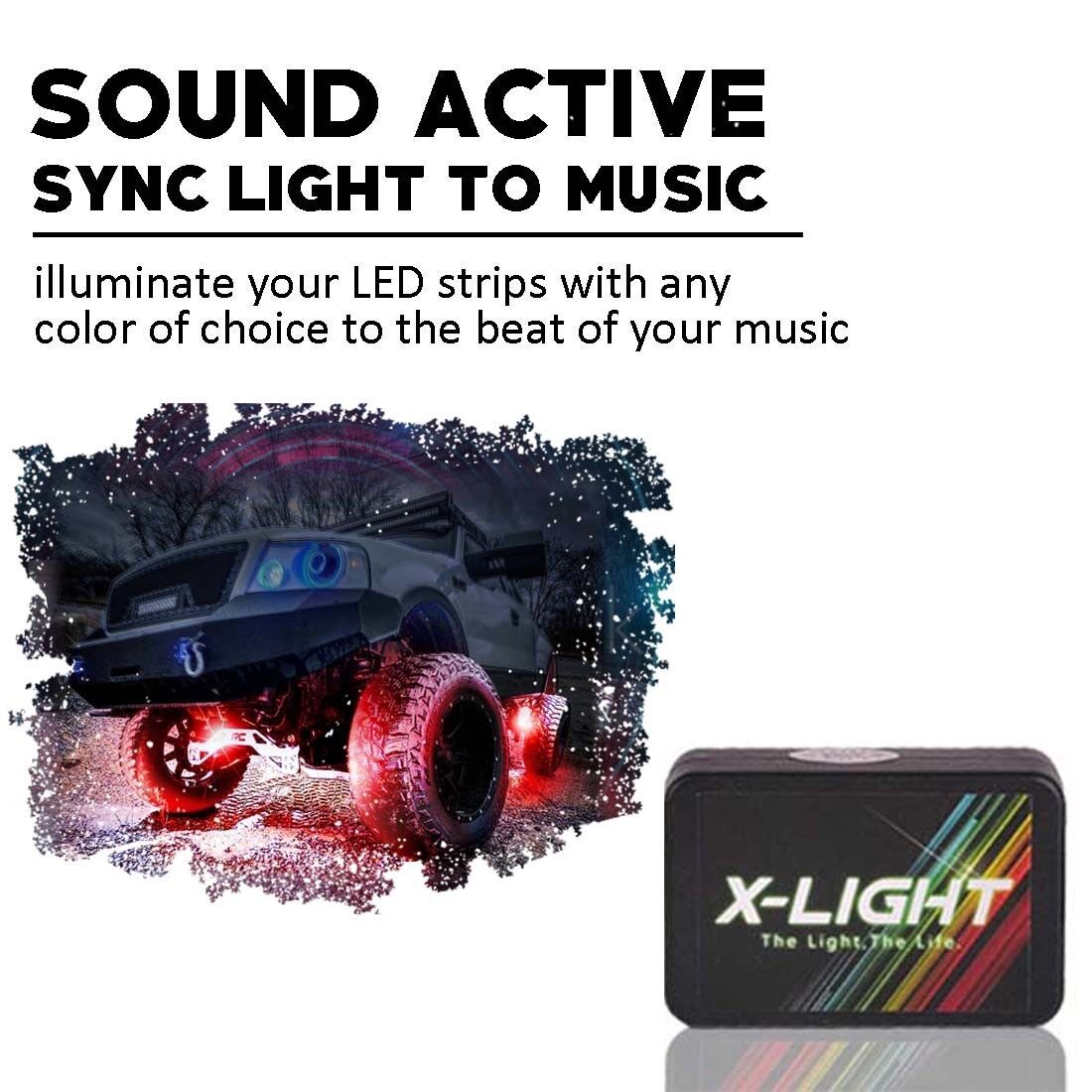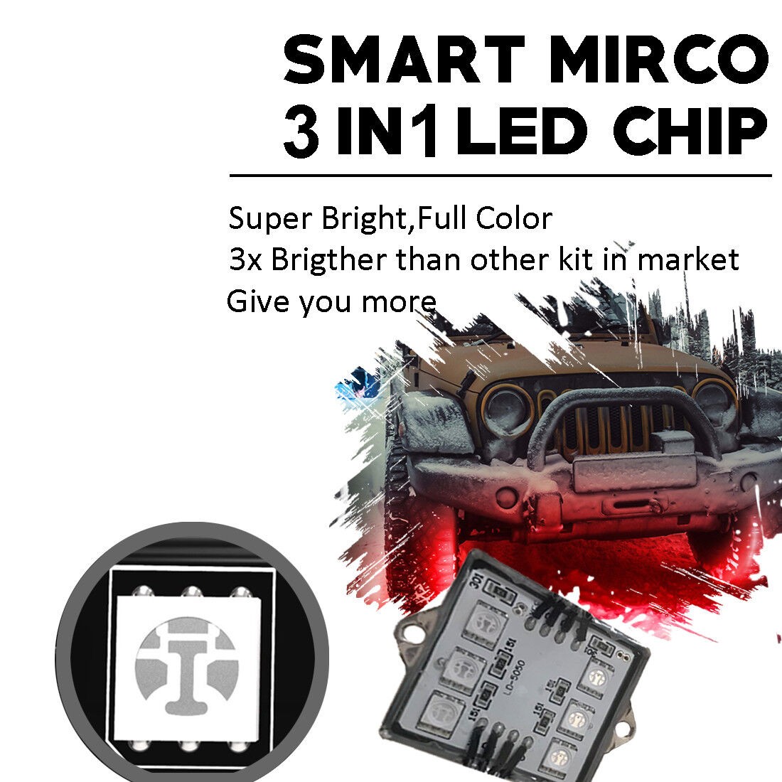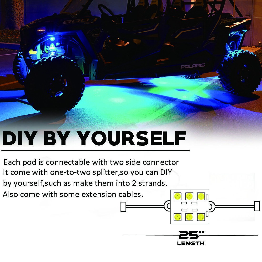 Two Ways to Control,Bluetooth Phone app + Remote, Music Active,Sync light to Music, High Power 3-in-1 LED,give you more, Brake Light Feature,red color when brake active, Easy Power switch cable, Plug and Play,easy install, Fit for any 5-24V ride, Come with 8 Pods,6 LEDs each pod
