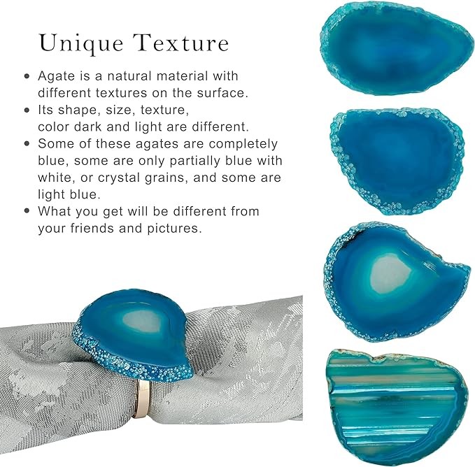✔Easy to Use and Clean: The surface of the agate slice and metail ring is smooth and can be cleaned by wiping with a damp cloth. The napkin can be directly put into the ring.
