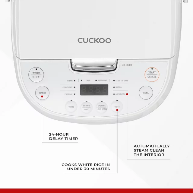 As an industry leader and a trusted Korean brand, CUCKOO strives to consistently deliver premium quality kitchenware and home products to households around the globe. Our 12-Cup (Cooked) Micom Rice Cooker & Warmer (CR-0605F) boasts preset functions to automatically cook your favorite rice and grains to your own customized liking along with a multi-cook function that can effortlessly prepare quinoa, oatmeal, soups, stews, and more! Its Stored Rice function is optimal for leftovers, its keep-warm mode will keep your cooked rice at serving temperatures without overcooking it, and its preset timer will allow you to put ingredients in the inner pot hours in advance and have fresh, perfectly cooked rice ready right when you want it. With seemingly endless features and functions like these, the mealtime possibilities are endless.