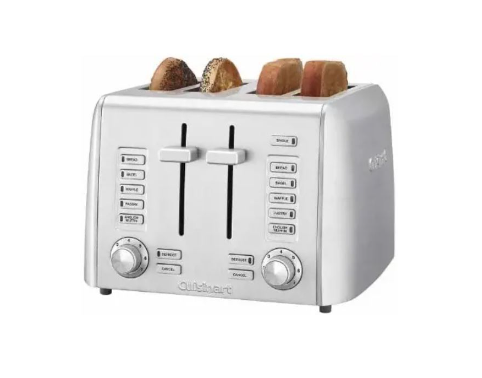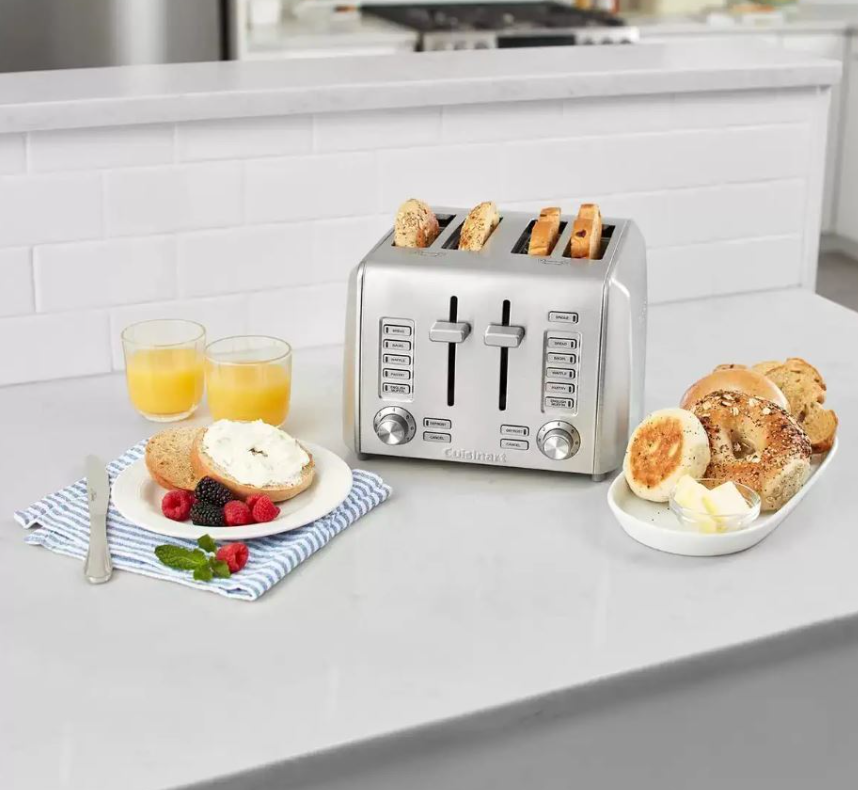 Function and fashion come together to deliver the best in style and performance. This sleek, stainless steel Cuisinart toaster is designed to accommodate all types of bread selections and shade preferences. Dual control panel with programmed settings for bread, bagels, English muffins, waffles, and toaster pastries Single Slice button adjusts heat to ensure both sides of a single slice are evenly toasted Self-adjusting toast slots to accommodate thick and thin items Custom defrost works in combination with bread type presets for accurate defrosting time Simple dial controls for 7 toast shade settings High-lift carriage for easy removal Crumb tray slides out for quick and easy cleanup Stainless steel classic, sleek styling.