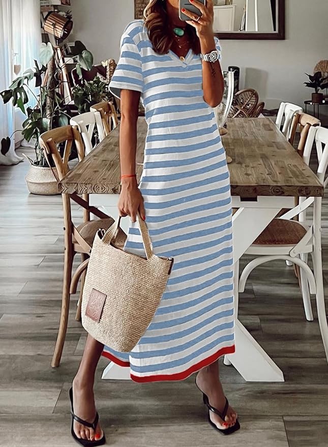 Dokotoo Summer Dress Casual Womens Fashion Short Sleeve Maxi Dress T Shirt Dress Striped Long Color Block Maxi Dress