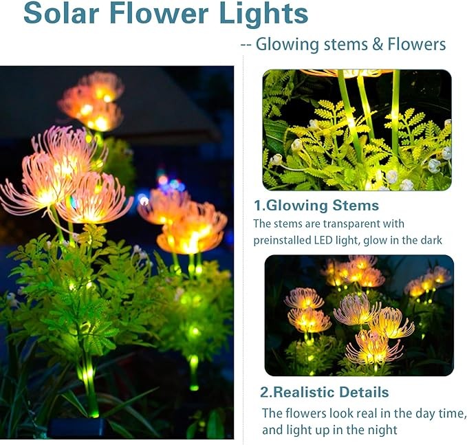 • 【BEAUTIFUL DESIGN】Our solar flower lights look like real flowers during the day, and transform into a beautiful light display at night. They provide a charming and unique addition to any garden or outdoor space
