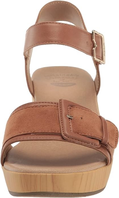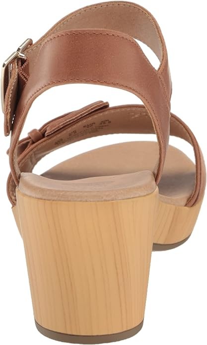 • STYLE: Dress sandal with statement buckle, faux wood heel for lightweight comfort, and 2 1/3 inch platform hee