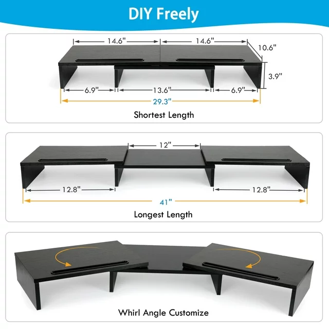 Adopting your usage habits, adjust the length and angle of this laptop stand by moving and splitting. Easily arrange your devices, e.g dual monitor, laptop, tablet, lamp, telephone, speaker, helping you to improve work efficacy.