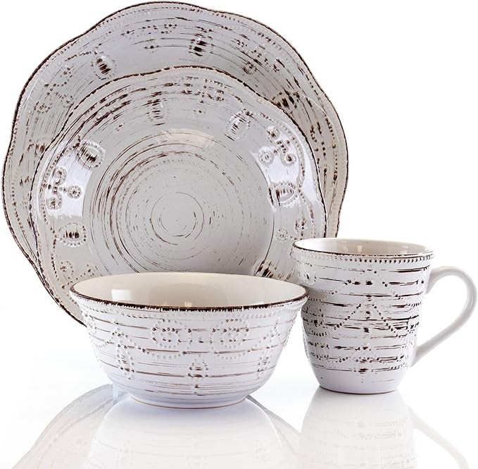• ◈A STUNNING ACCENT TO YOUR TABLE◈ The Elama Rustic Birch 16 Piece Embossed Scalloped Stoneware Round Dinnerware Set in White with Brown Accents