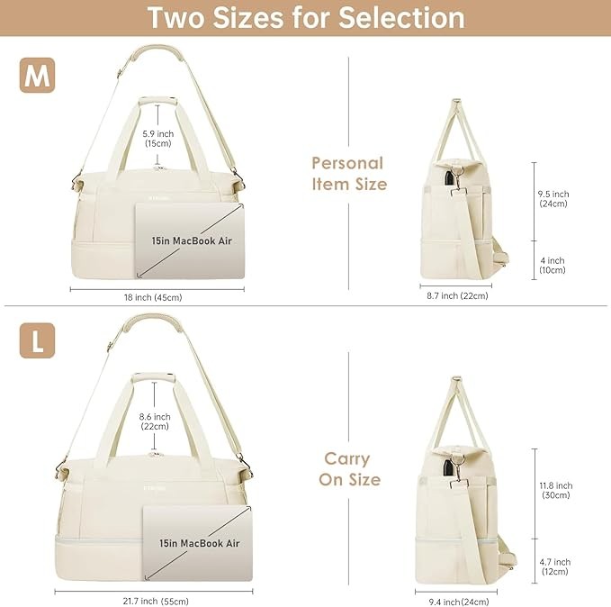 • ✅【Dry Wet Separate Duffel Bag】:This duffle bag for women delivers roomy main compartment to store your clothes and items. A zippered waterproof PVC lined pocket for wet clothes or towels and swimsuits. In addition, this travel duffel bag also gives an extra small makeup bag for easy storage.