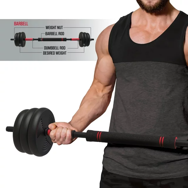 • 4-in-1 interchangeable weight system can be used as a barbell, kettlebell, two dumbbells, or push-up handles