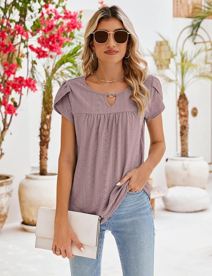 ❤Soft Material: This petal short sleeve shirts is made of eyelet fabric, soft, comfy and flowy, and the breathable fabric will keep you cool all summer.