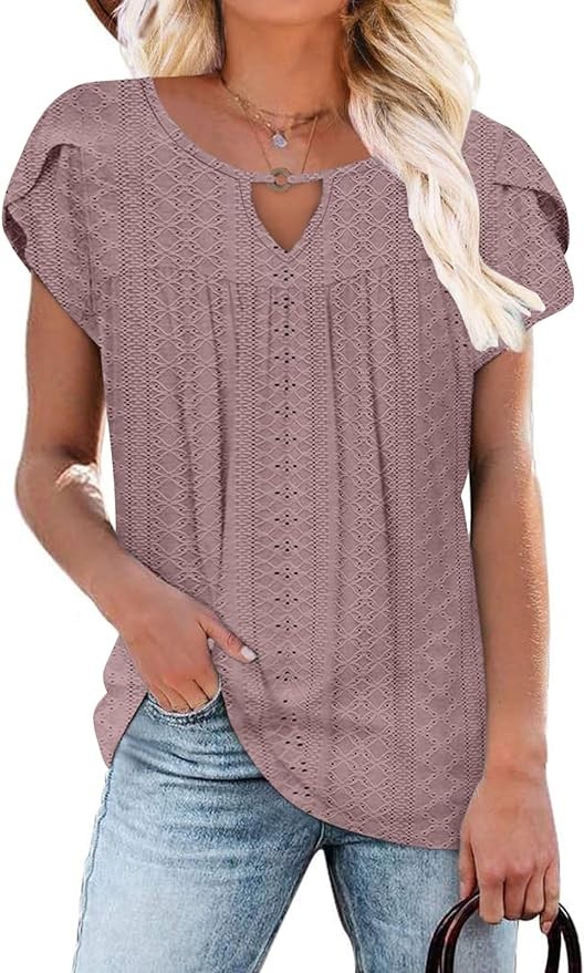 ❤Fashion Features: Womens summer tops feature a fashion new design, cute petal sleeve, crew neck, key hole at the neck, hollow out design, pleated. Loose fit and tunic design, better hides the belly, suitable for all body types.