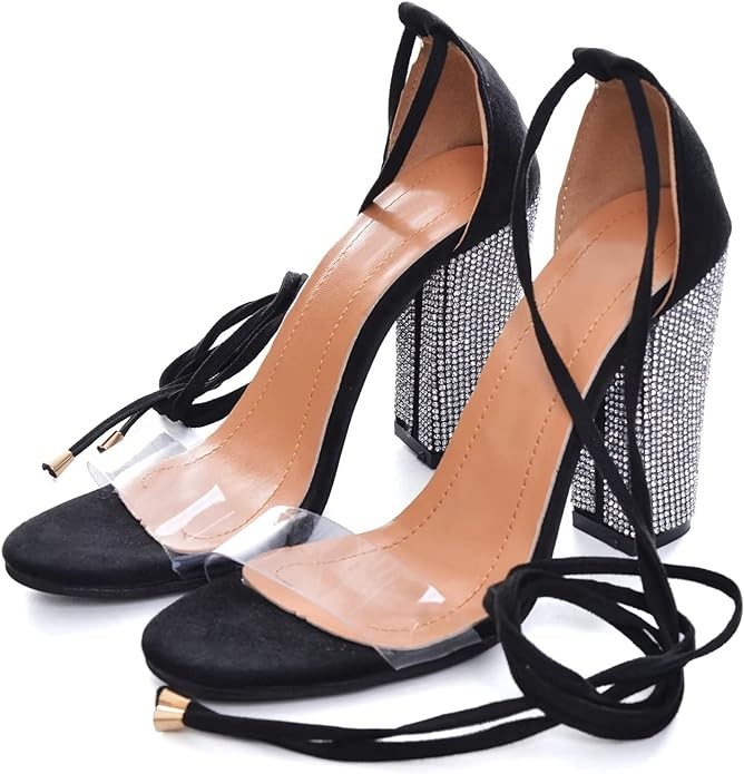 • Heel measures approximately 10CM ( 3.9 inches)the most comfortable and elegant height for women,PVC clear lucite man-made material upper with flash little diamonds block heel, anti-slip rubber outsole and soft arch support insole.