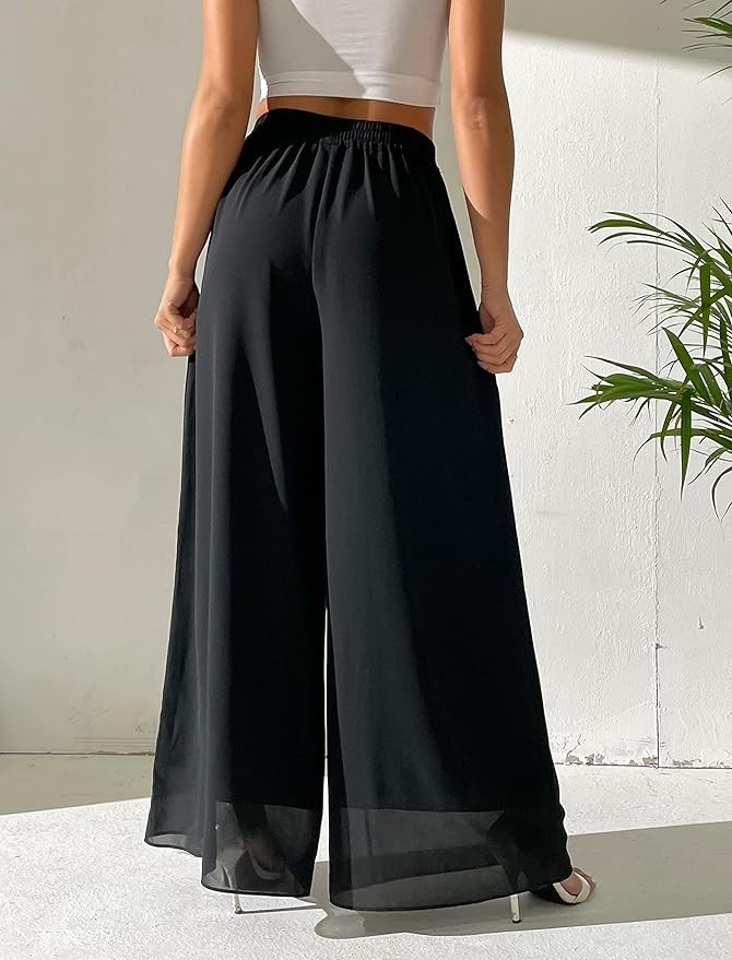 heipeiwa Women's Chiffon Dress Beach Wide Leg Palazzo Pants Elastic Waist Trouser