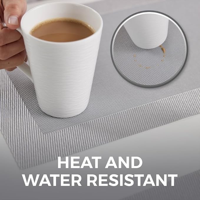 • HEAT AND WATER RESISTANT: designed for everyday use, high quality woven vinyl construction resists water and heat for optimum protection; heat resistant material shields surfaces from hot plates, mugs and dishes up to 185 degrees Fahrenheit