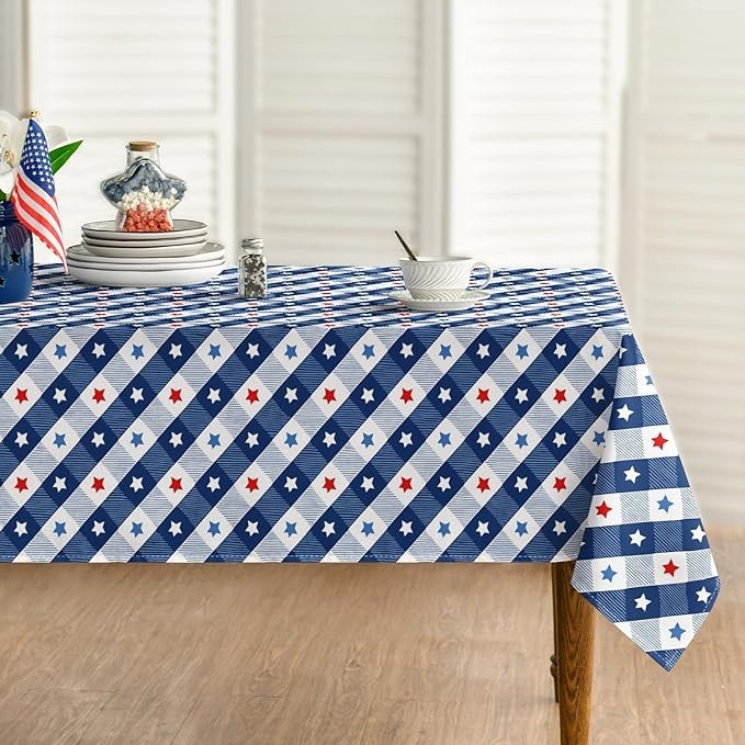 Horaldaily 4th of July Tablecloth 60x104 Inch Rectangular, Patriotic Blue Buffalo Plaid Stars Independence Day Memorial Day Table Cover for Party Picnic Dinner Decor