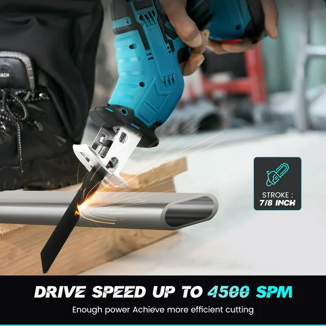 HUKOER 21V reciprocating saw provides better performance and a longer lifespan. The variable speed trigger provides stroke up to 4500 times per minute, depending on how hard it is pressed. Take on wood and PVC up to 4 inches thick ,and metal up to 7/8 inches thick. Suitable for pruning your tree and shrubs, demolition in small or difficult spaces, cutting plumbing pipes, making your pet house.