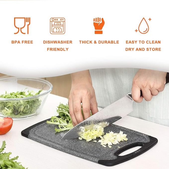 • 【A High quality Kitchen Cutting Board】KIMIUP Kitchen Cutting Board is made from non porous plastic that ultra durable and highly resistant to heat.The plastic cutting boards for kitchen contain no BPA,it is safety for your family to use this Kitchen Cutting Board (Set of 3).
