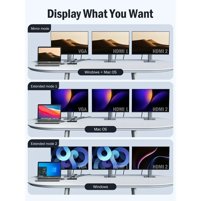【4K HDMI to USB C Hub】2 HDMI ports of this hub supports up to 4K@30Hz, which can perfectly mirror or expand your screen to HDTV, monitor, projector.