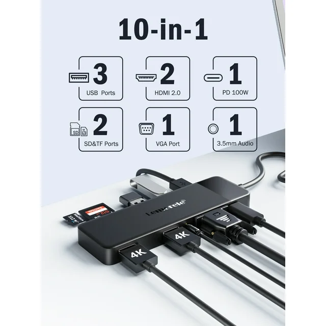 【10-in-1 USB C Hub】 Lemorele USB C Hub is equipped with all the necessary functionsyou’re your daily life and general work, including 2x 4K@30hz HDMI port, 1x100w PD charging port, 1x USB 3. 0 Type A data ports, 2x USB 2. 0 Type A data ports.
