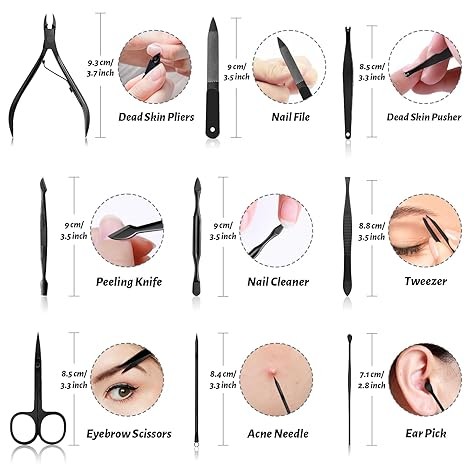 • ??Manicure Set Include: You will receive 12 pieces of tools (Large Nail Clipper, Small Nail Clipper, Diagonal Nail Clipper, Dead Skin Pliers, Nail File, Double-headed Pick, Scraper, U-shape Cuticle Trimmer, Tweezer, Acne Needle, Eyebrow Scissors, Ear Pick) for hands, feet and facial care to meet your personal care needs.
