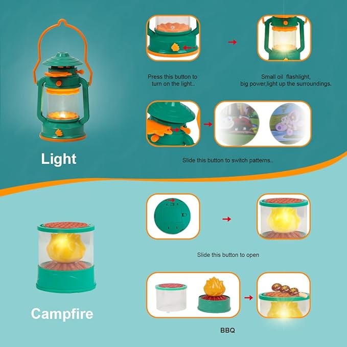 BATTERY-POWERED KIDS CAMPING GEAR TOYS: A true-to-life campfire with extendable stand and oil lantern can light up with 3 AA batteries (not included) and adjust the binoculars to see the world.