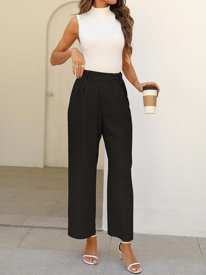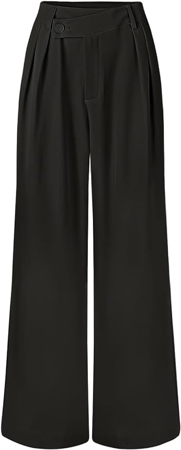 Unique Design: High waist, wide leg, long straight pants, asymmetrical overlap button at waist, pleated front, side pockets, solid color, casual and relaxed fit, light colors are lined.