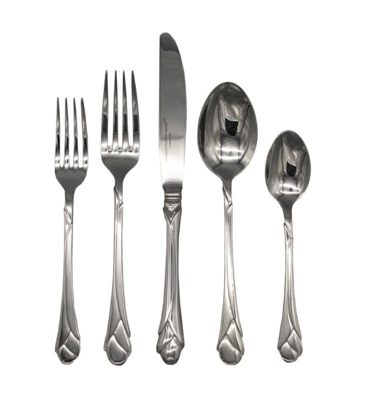 Included is: one dinner knife - measuring 9 1/4" in length, one dinner fork - measuring 8" in length, one salad fork - measuring 7 1/4" in length, one place spoon - measuring 7 3/4" in length, one teaspoon measuring 6 3/8" in length.