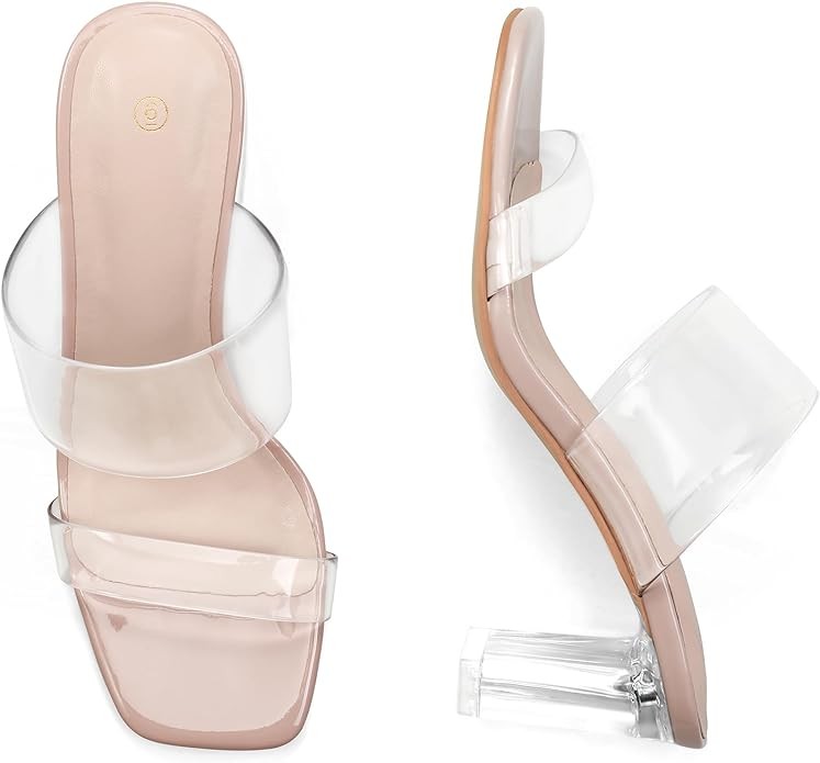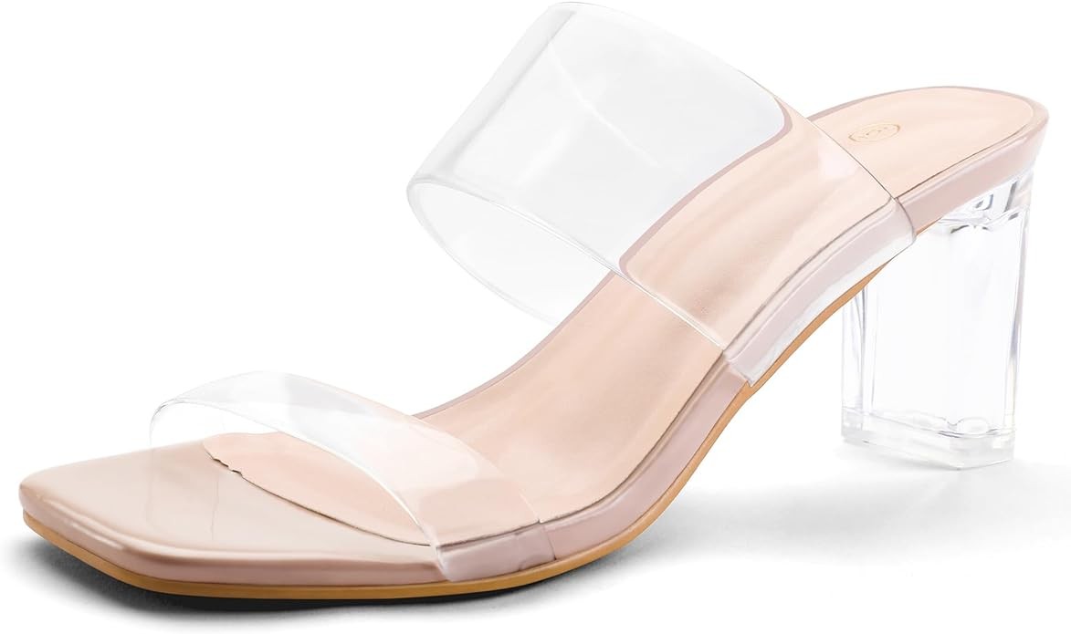 mysoft Clear Heels for Women Transparent Two Strap Block Chunky Square Heel Sandals Open Toe Slip On Sandals