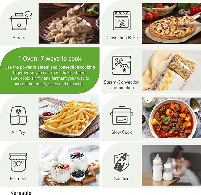 • 7 Functions, 1 Oven: Versatile oven with an incredible range of options for cooking and prep—Convection Bake, Steam, Steam-Convection Bake combo, Airfry, Slow Cook, Ferment, and Sanitize—for healthy cooking of new and favorite dishes