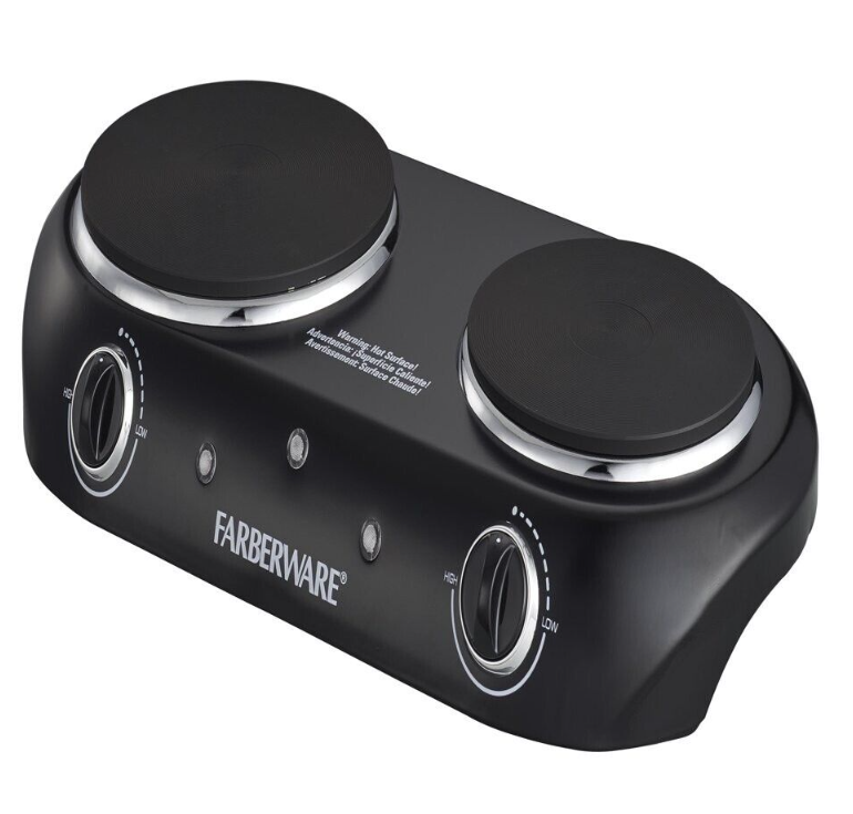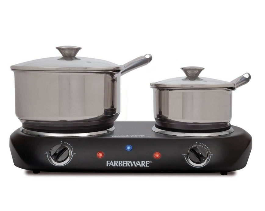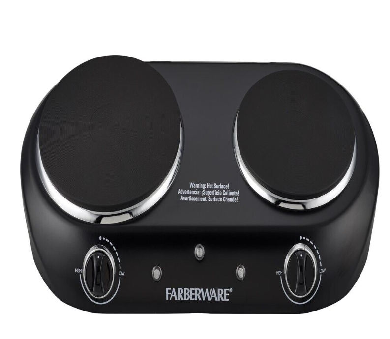 Farberware Double Burner Electric Cooktop expands your at-home kitchen capabilities. User-friendly design is suitable for beginners as well as pros. Dual burners allow for preparation of two different dishes or meal components at once. Durable die-cast plates heat consistently for even cookingPower light clearly indicates when the unit is on while Ready light indicates when the desired temperature is reached. Rubber feet provide stability, keeping the unit in place, while back bumpers provide safety, keeping the unit away from walls. Lightweight construction facilitates convenient portability