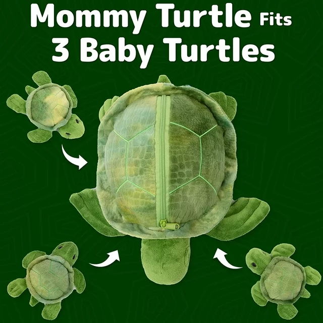 Prextex uniquely designed patent-pending handcrafted plush mommy turtle with 3 little turtles will make the perfect gift for any turtle lover. Zip the baby turtles inside the big turtle for easy storage and carrying. It includes three premium quality, washable baby turtle with one big 24'' zippered turtle mom. This uniquely designed giant turtle is a fitting home for the splendid, soft babies hours of imaginative play, and the best Christmas gift for kids of all ages.