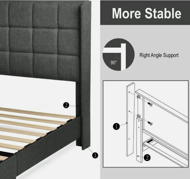 The platform bed is full of modern charm and traditional comfort. It is a bed with excellent style and soundproof mattress support. The feature of this bed frame is the wingbacks on both sides of the headboard. With equivalent wooden slats support, the platform bed frame can support the mattress without adding box springs, but please pay attention to the 10.2-inch gap between the headboard and slats, the height of your mattress should be suitable for the gap. And if you prefer the bed to be higher, you could use a box spring. Its frame is composed of a durable "+" shape sell structure and central support leg, which can eliminate sagging and extend the life of the mattress.