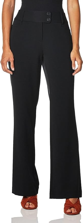 AT THE OFFICE OR AFTER HOURS: Look sharp in these curvy dress pants for women that feature a slightly flared bootcut leg with a 20-inch opening, two functional front pockets, two back welt pockets, a zipper fly with double-button closure, and belt loops.