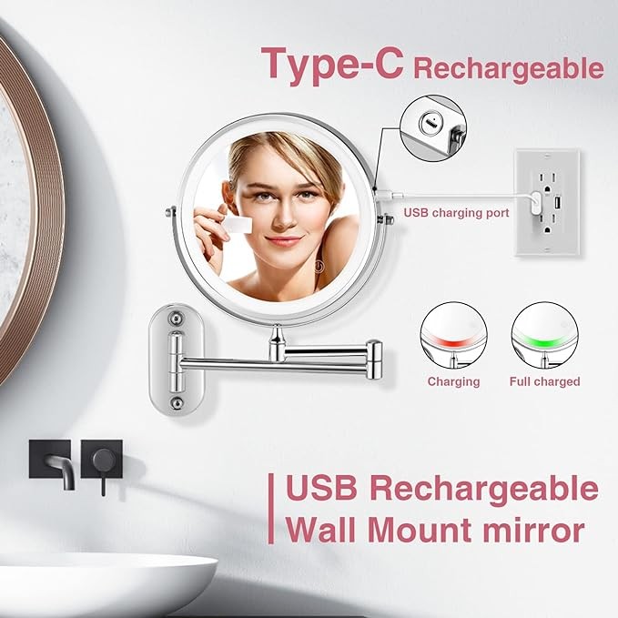 Ideal Gift and After Sales Service: The wall mounted makeup mirror is a great gift for friends,Girlfriend,Wife and mother on birthdays,Anniversaries,Mothers' day and Christmas.We are specialized in the production of high-end makeup mirror and protect the mirror with layers of packaging.But if you are not 100% satisfied with the wall mounted makeup mirror,Please feel free to contact us and We will sincerely service for you!Noted: Please fully charge it before first use!