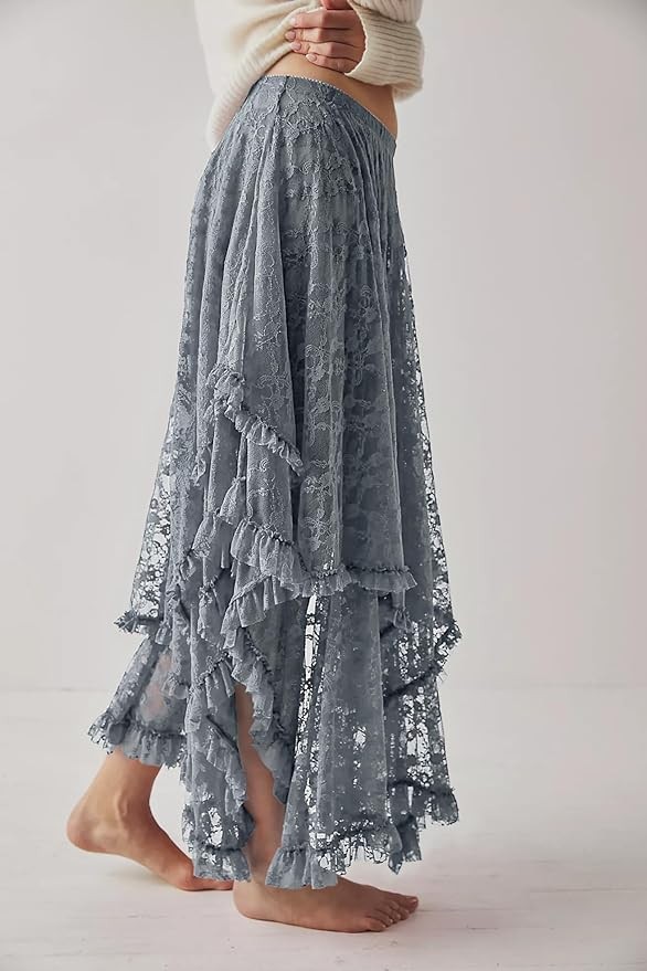 DESIGN: This long skirt looks nice and understated that has elasticity at the waist, which flexible fit your waist size and makes you comfortable to wear. Lace print pair with a fluffy and layered hem to this cute skirt brings a sexy and romantic vibe. Wearing this boho skirt pair with other styles of tops or bikinis to walk on the beach that will be a unique and beautiful scenery!
